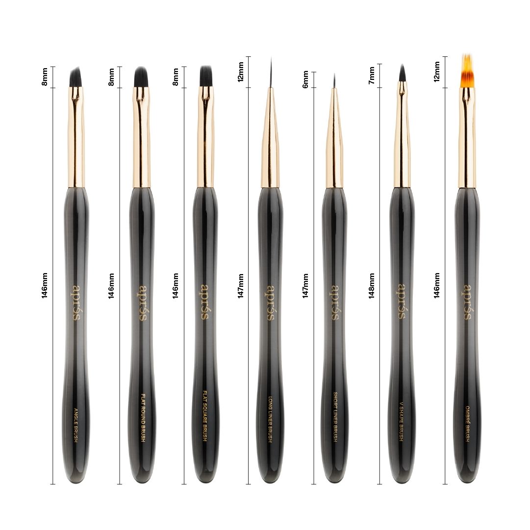 Aprés Art Brushes are versatile, high-quality tools that allow for easy application and creative nail art. Manufactured with PBT fibers, these brushes will be able to withstand constant and regular use without warping or falling out. Crafted with an ergonomic handle designed for optimal comfort and control, the Aprés Art Brush empowers you to achieve unparalleled accuracy. The ferrule perfectly balances the brush head, preventing fatigue and enhancing your artistic expression. A durable silicone cap is included with every brush, ensuring your brush is carefully encased and protected.