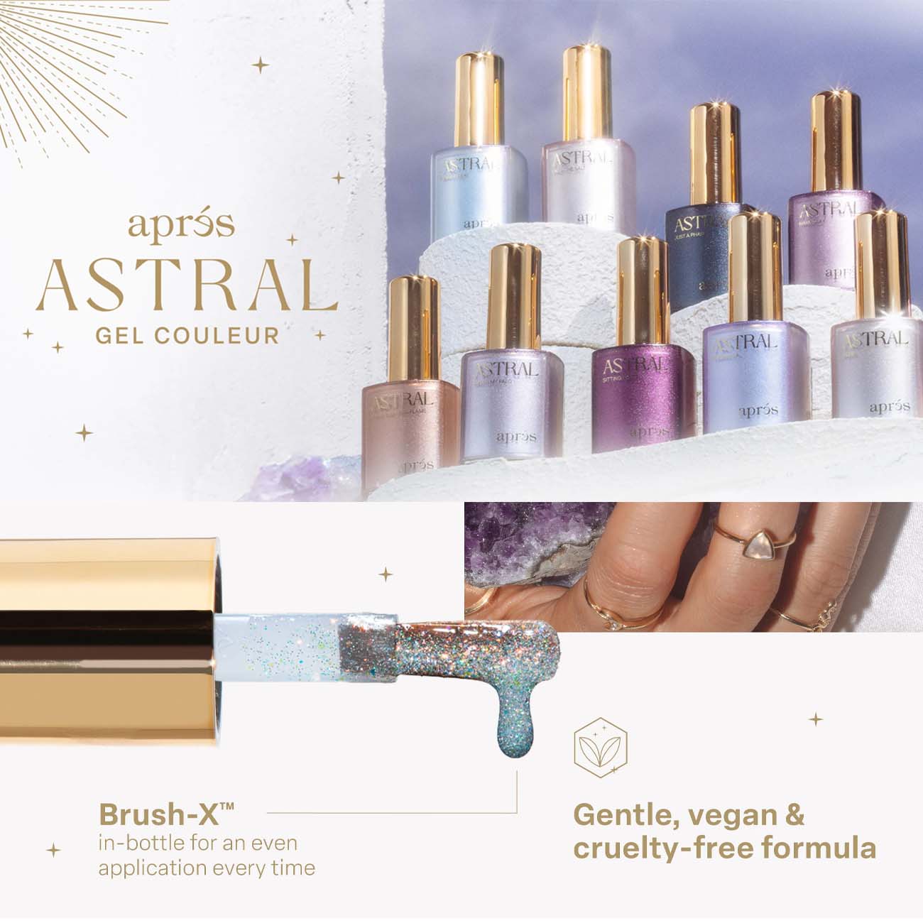 Aprés Astral Gel Couleur is a collection of 40 shades in 4 light-refracting, otherworldly finishes—Flash Glitter, Pearlescent, Velvet, and Shimmer Cat Eye. These streak-free, self-leveling formulas leave a unique energetic signature on the nail, empowering you to create looks that resonate on a spiritual level.