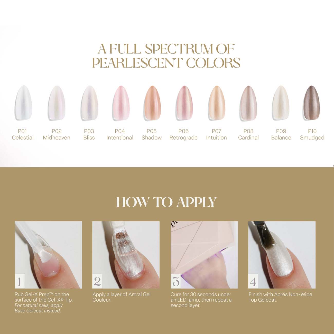 Aprés Astral Gel Couleur is a collection of 40 shades in 4 light-refracting, otherworldly finishes—Flash Glitter, Pearlescent, Velvet, and Shimmer Cat Eye. These streak-free, self-leveling formulas leave a unique energetic signature on the nail, empowering you to create looks that resonate on a spiritual level.