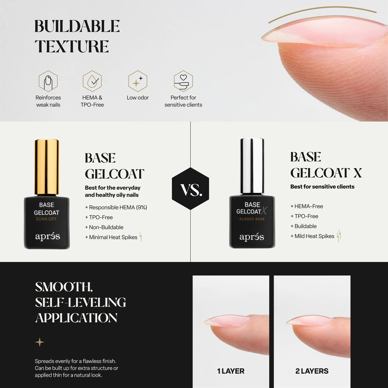Base Gelcoat X is our most supportive foundation yet. This rubberized base coat delivers superior grip and long-lasting wear without irritation. Its thicker, self-leveling consistency creates a smooth, buildable layer that strengthens weak or thin nails, while remaining HEMA- and TPO-free for gentle, inclusive application.