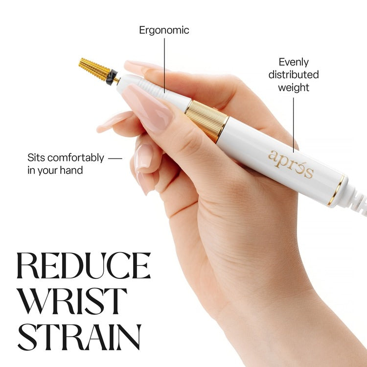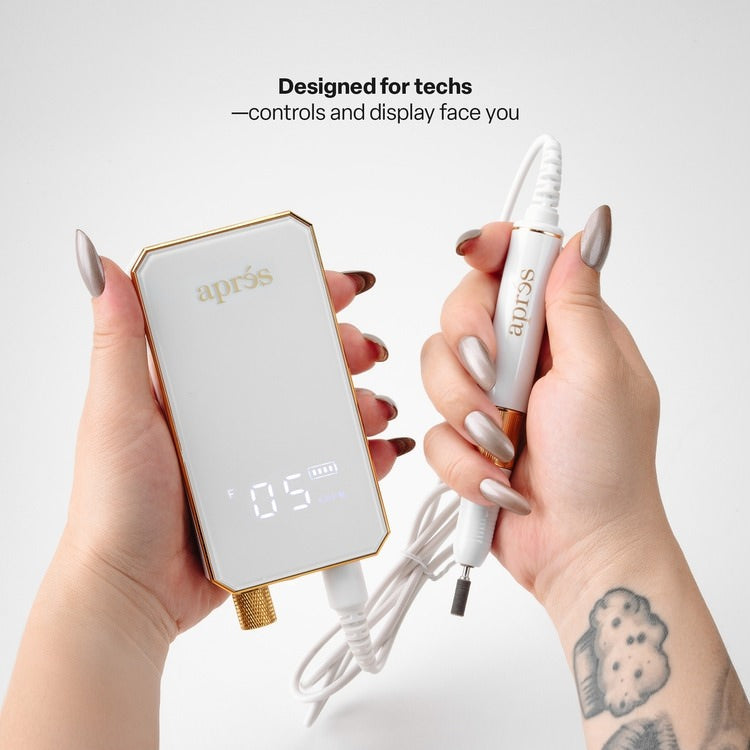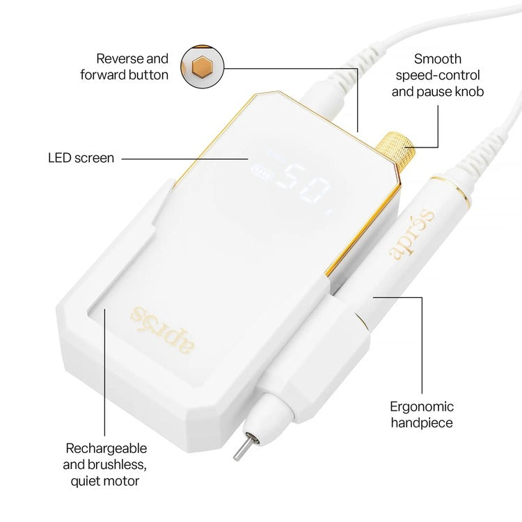 Aprés E-File Includes: E-File, case, handpiece and cord, handpiece holder, AC adapter charger and instruction/warranty manual.
