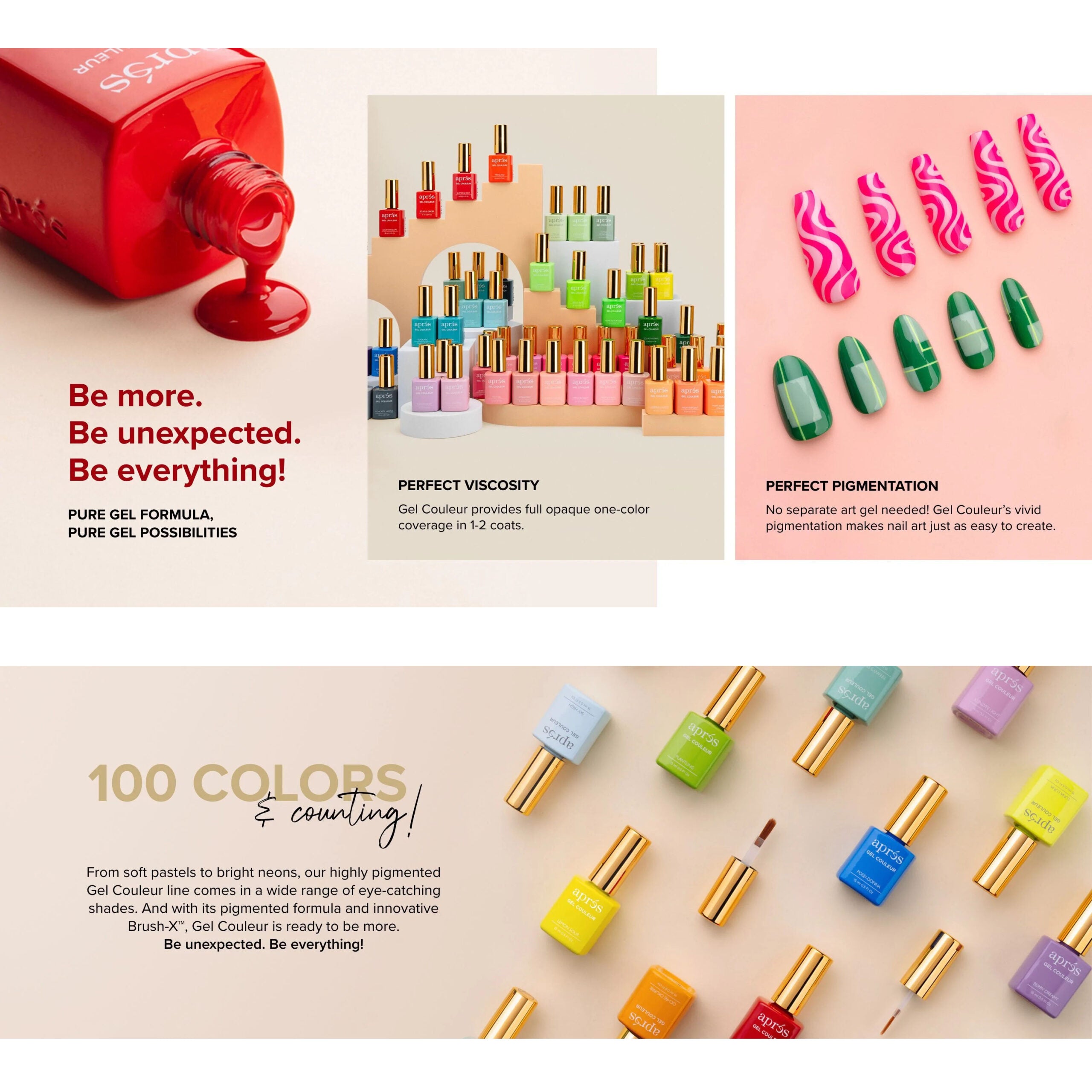 Apres Gel Couleur offers a smooth, highly pigmented formula that provides amazing colour payoff. But Gel Couleur takes it a step further by also providing the perfect tool along with the perfect colour. Included is our completely revolutionary in-bottle Brush-X that is both a convenient tool for pros and a helpful aid for DIYers.