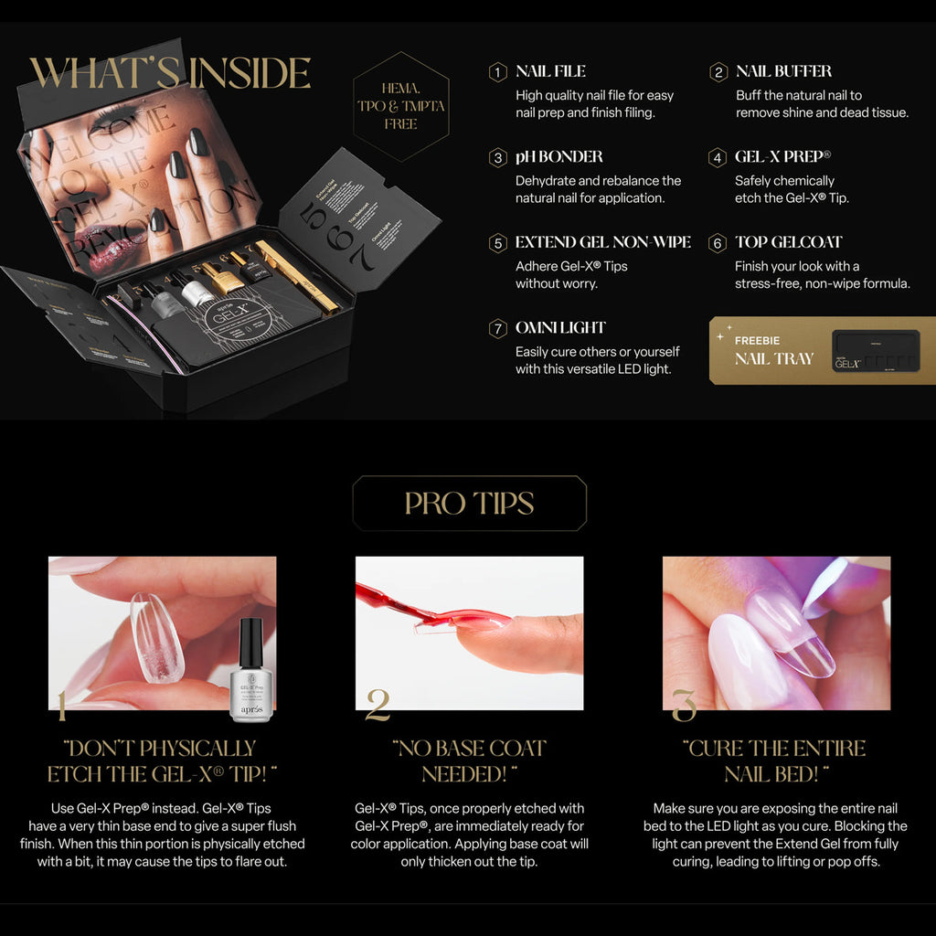 Meet the new Aprés Signature Gel-X® Kit—the world’s first full-coverage soft gel extension system. This completely HEMA- and TPO-free kit includes everything you need to create a flawless Gel-X® set. From our patented, award-winning Gel-X® Tips to our gentle but powerful Extend Gel formula, beautiful nails of any length or shape are easily within your reach in half the time of other extension methods.