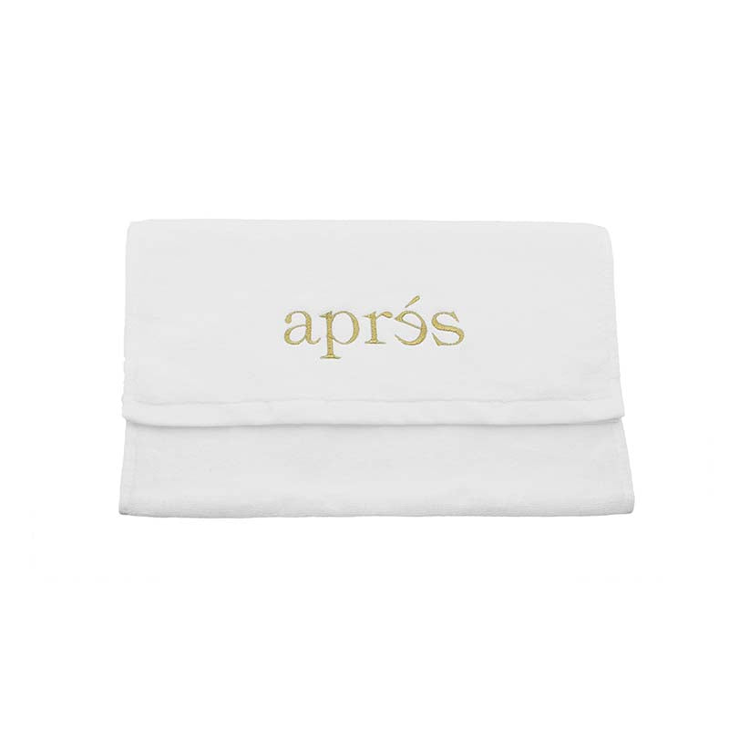 Apres hand towel brings style and comfort into your everyday salon routine. This hand towel is made from 100% premium cotton and is large enough to fit any standard workstation. Use Apres hand towel to keep your workstation free from dust particles, cuticle trimmings, and other impurities. This soft cotton towel is available in pure white with an embroidered black or gold Apres logo.
