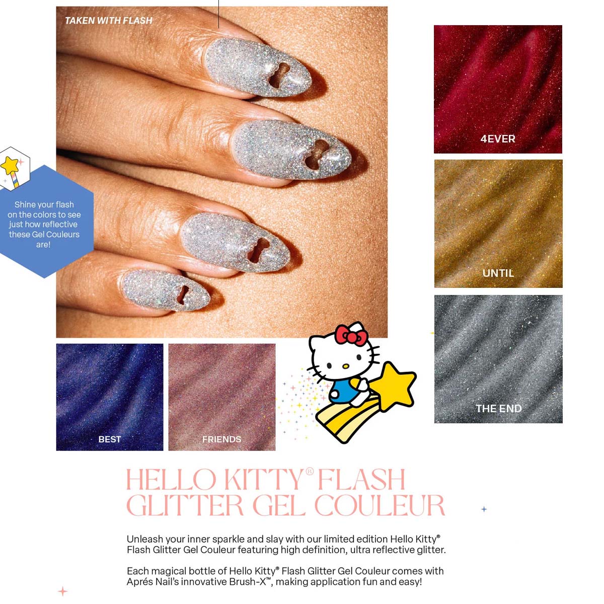 - Apply a layer of ultra reflective Hello Kitty® Flash Glitter Gel Couleur and cure in an LED light for 30s. Finish with Aprés Non-Wipe Top Gelcoat and you’re ready to shine bright all day with your besties by your side.