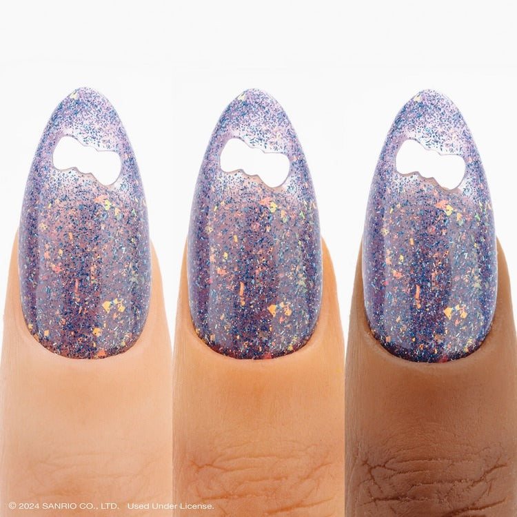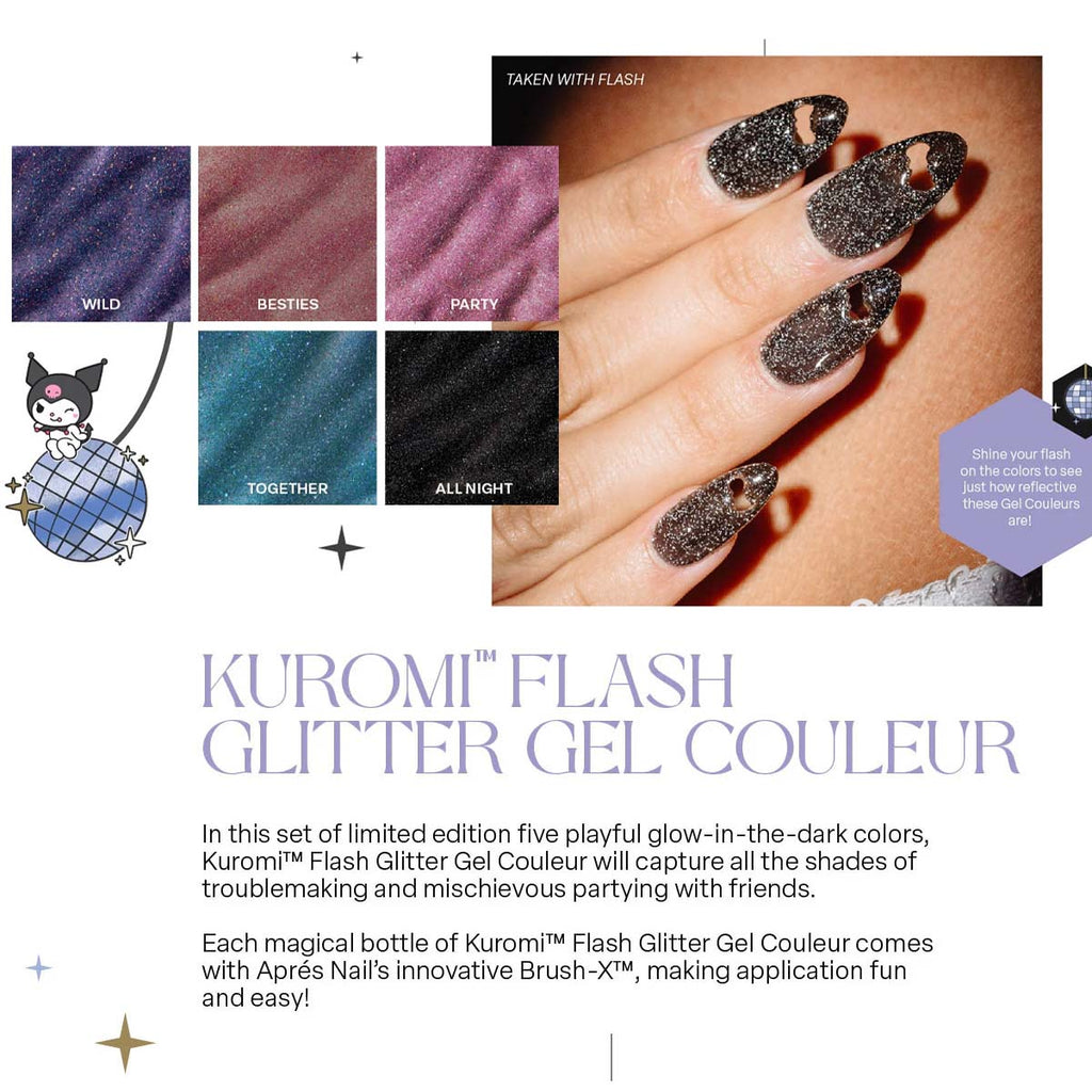- Apply a layer of ultra reflective Kuromi™ Flash Glitter Gel Couleur and cure in an LED light for 30s. Finish with Aprés Non-Wipe Top Gelcoat and you’re ready to shine bright all day with your besties by your side.