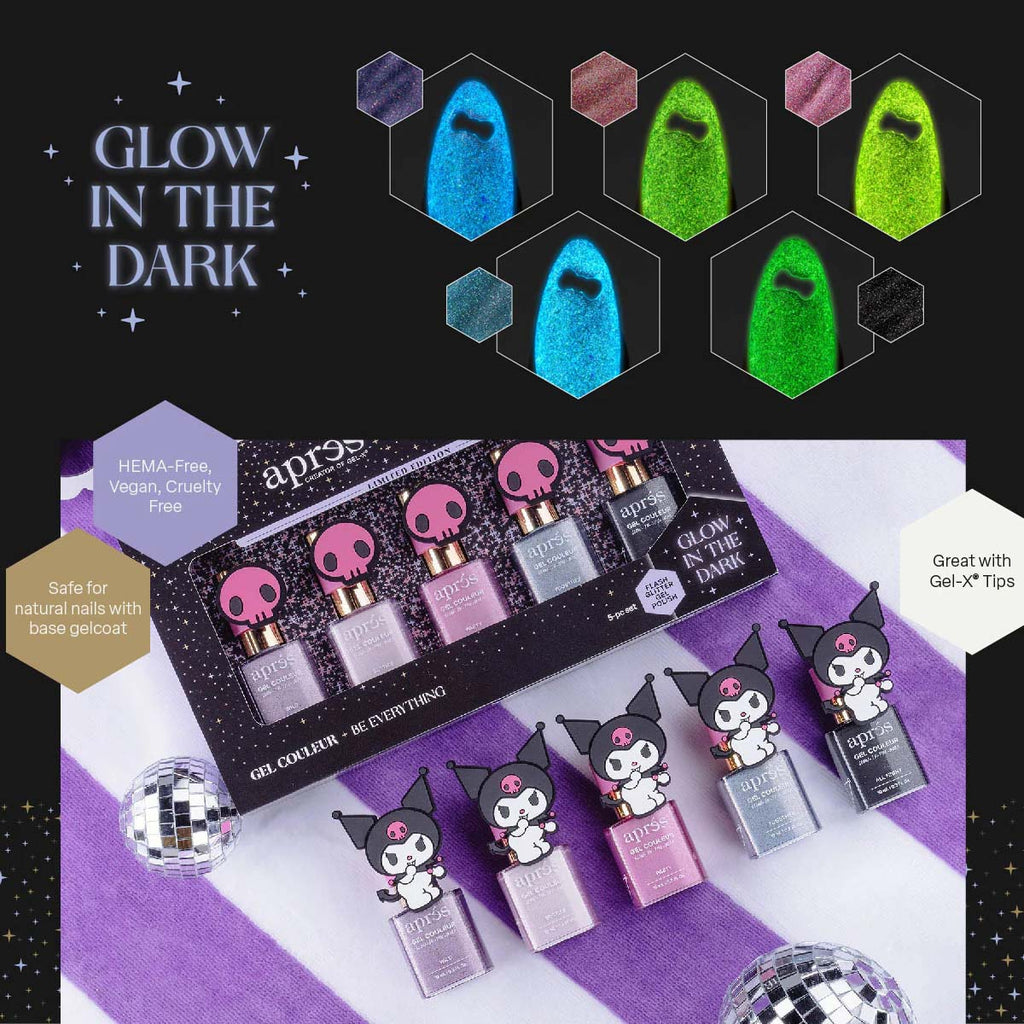 In this set of limited edition five playful glow-in-the-dark colours, Kuromi™ Flash Glitter Gel Couleur will capture all the shades of troublemaking and mischievous fun with friends. Each magical bottle of Kuromi™ Flash Glitter Gel Couleur comes with Aprés Nail’s innovative Brush-X™, making application fun and easy! The Kuromi™ Flash Glitter Gel Couleur is HEMA-free, vegan and cruelty-free and safe for natural nails with a base gelcoat and great with Gel-X® Tips.