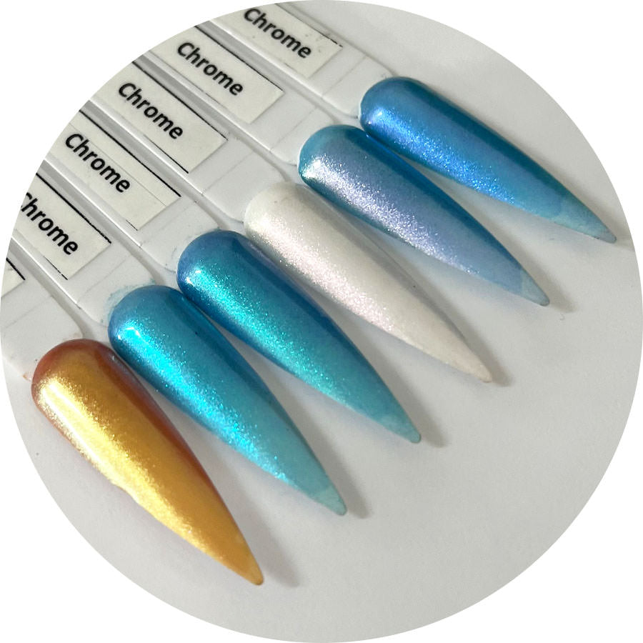 This new series of 6 different chrome pigment powders can be used on both black or white base gel colours.