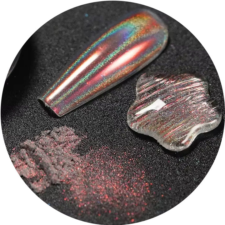 Our selective range of LUXX Aurora Holographic chrome finish nail powder can be used on both black, white, clear or any coloured base. This holographic glitter effect gives the nail a chrome or mirror like appearance!