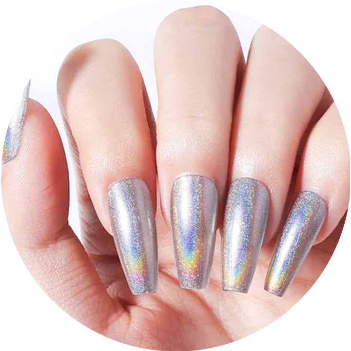 Our selective range of LUXX Aurora Holographic chrome finish nail powder can be used on both black, white, clear or any coloured base. This holographic glitter effect gives the nail a chrome or mirror like appearance!