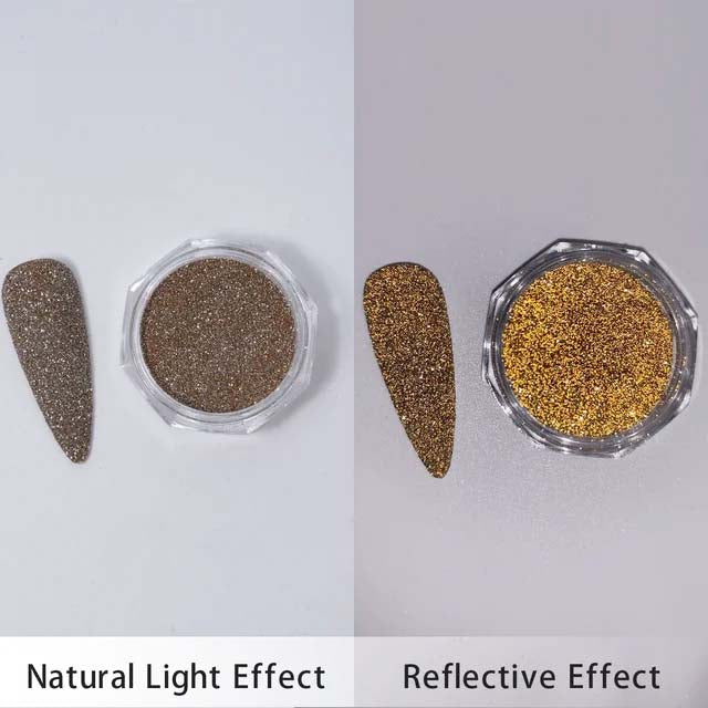 The super fine powder offers additional larger triangles which reflects larger areas of light. This option creates a gorgeous feature nail by applying it to the top coat of your "no wipe" UV gel polish for a raw dry finish or embed into your clear builder gel.