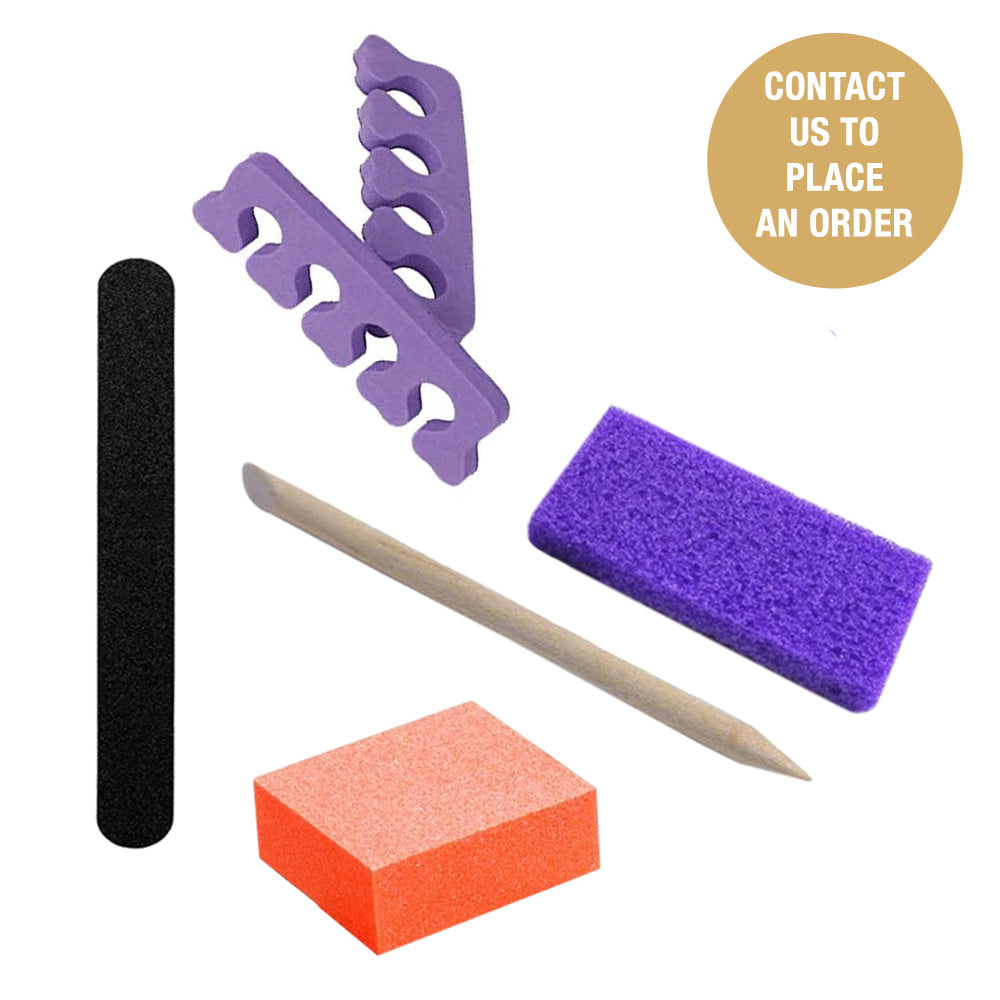 Disposable essentials for your ultimate manicure and pedicure service including: 1 mini pumice pad, 1 mini nail file, 2 toe separators, 1 mini orange stick and 1 mini buffer block. Great for bulk uses.